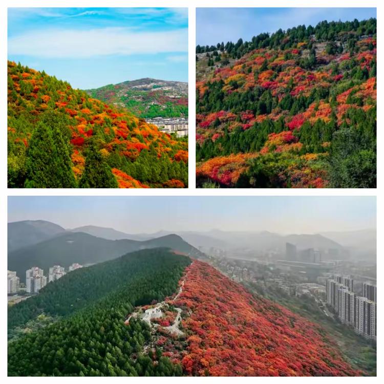 蝎子山坐落于市中區(qū)南部,形似翹尾蝎子靜臥城市之中。前段時(shí)間,這里因獨(dú)特的地理?xiàng)l件與植被分布“造就”了一波罕見的景觀:北坡松柏疊翠常青,南坡黃櫨天寒染赤,山脊天然劃界形成“一山雙色”的視覺奇觀,航拍視角下宛如一鍋煮沸的“鴛鴦火鍋”,每一張照片都堪稱壁紙。