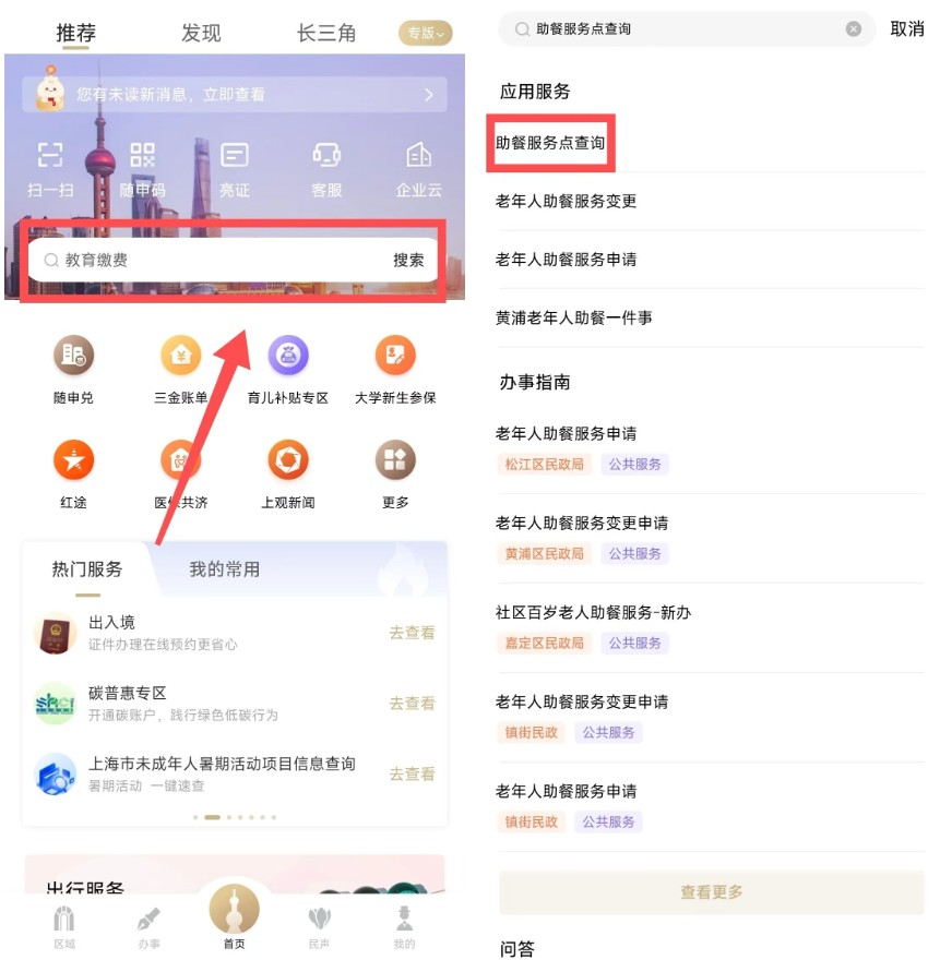 打開“隨申辦市民云”APP,在首頁通過關(guān)鍵詞搜索“助餐服務(wù)點查詢”,點擊對應(yīng)選項即可進入服務(wù)。