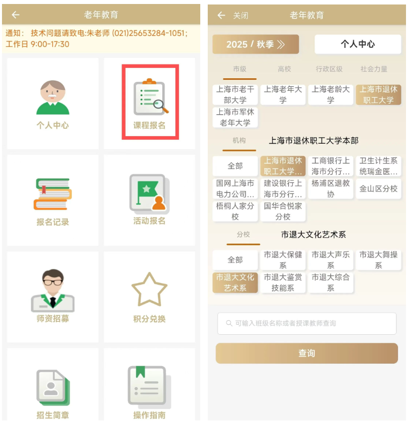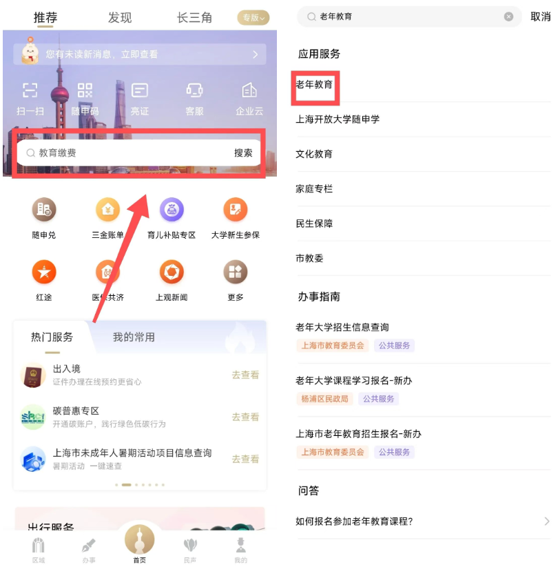 每年上海春季、秋季老年教育招生開始后,感興趣的老年用戶可以登錄“隨申辦市民云”APP,首頁搜索關(guān)鍵詞“老年教育”,進入對應(yīng)服務(wù)在線報名。