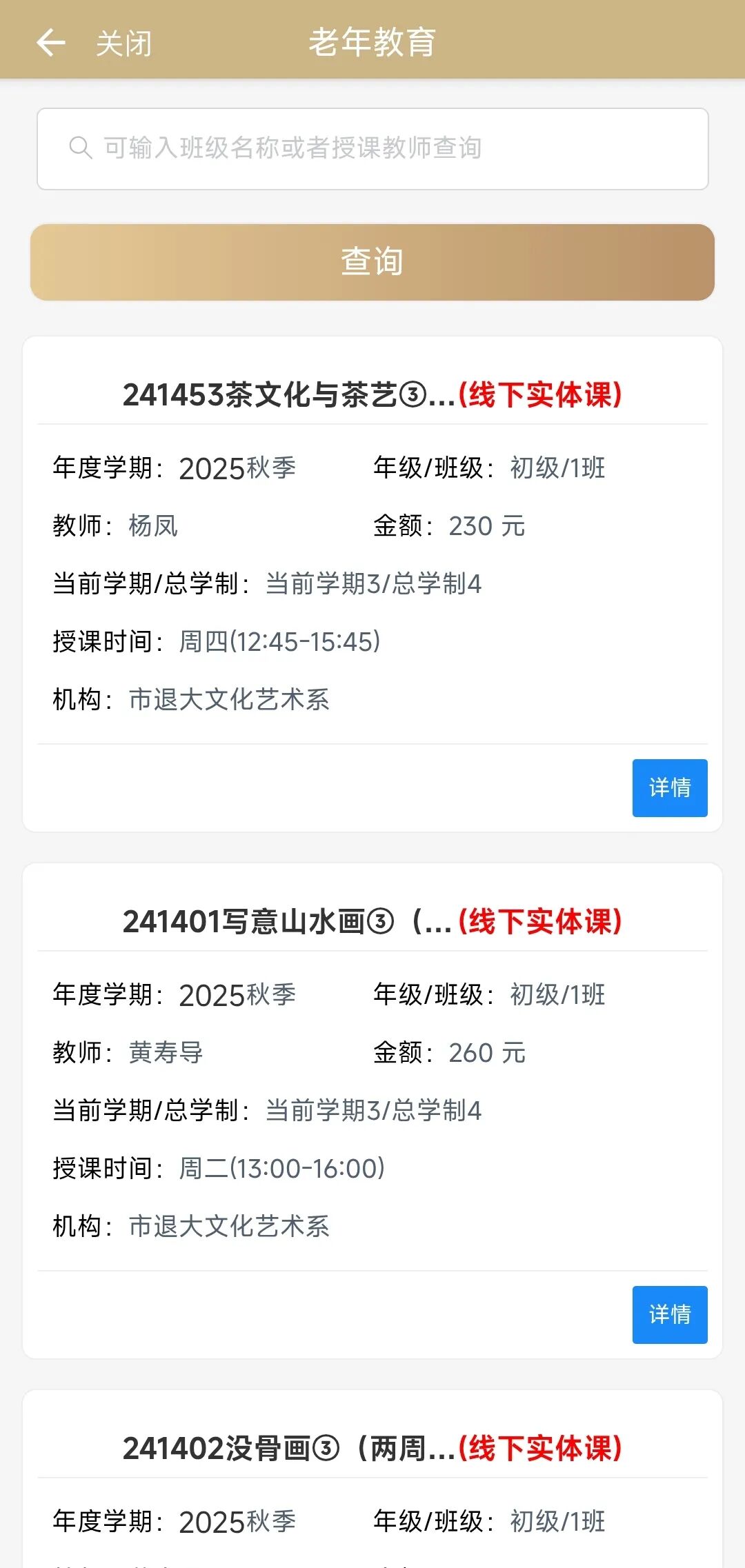 跳轉(zhuǎn)至課程列表頁后,即可查看課程基本信息。點擊“詳情”,進一步了解學校招生簡章、授課時間、授課地址、課程費用和退課操作等信息。點擊“報名”進行線上報名。