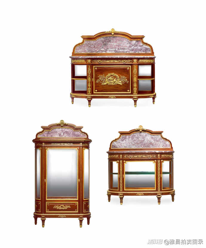 1.路易十六樣式銅鎏金裝飾桃花心木餐邊柜高176cm;寬189cm;深61cm;2.路易十六樣式銅鎏金裝飾桃花心木展示柜高221cm;寬130cm;深43cm;3.路易十六樣式銅鎏金裝飾桃花心木餐具展示柜高165cm;寬150cm;深51cm