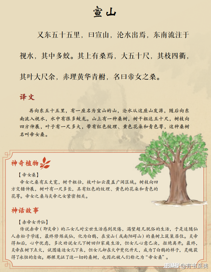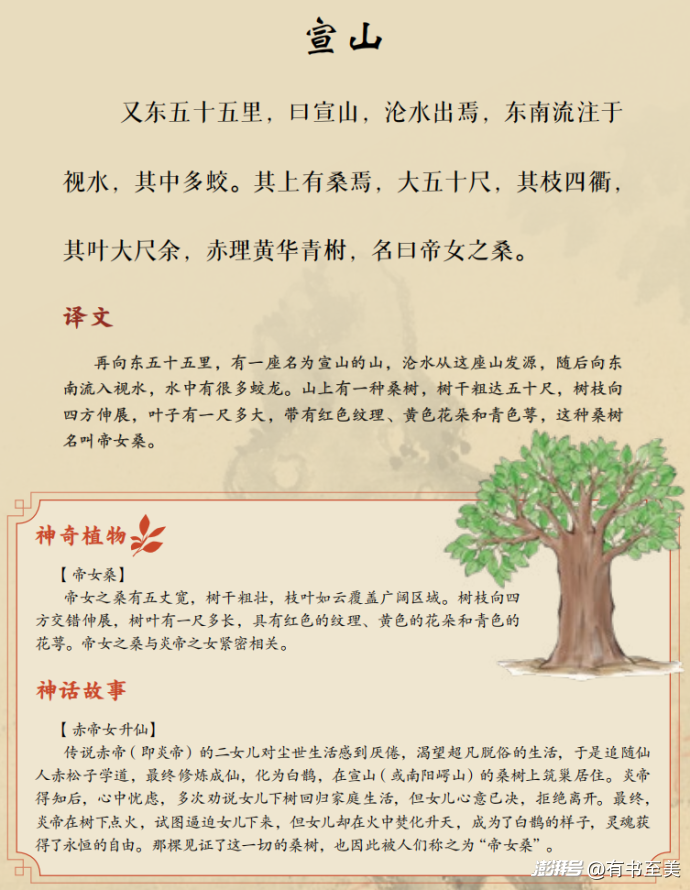 比如《山海經(jīng)·中山經(jīng)》中的“帝女之?!?,雖然原文介紹了它的特點(diǎn),卻沒有解釋為什么叫“帝女桑”這個(gè)奇怪的名字。
