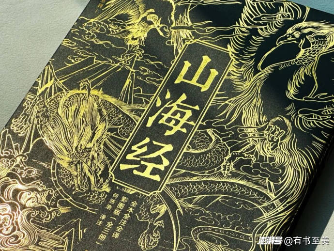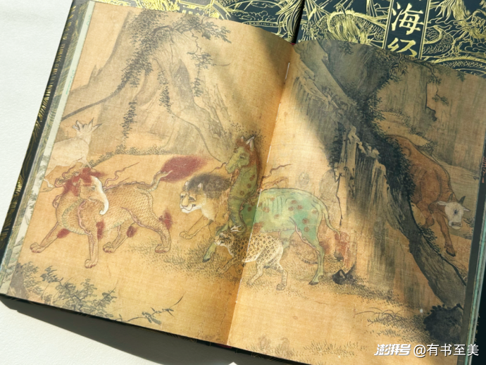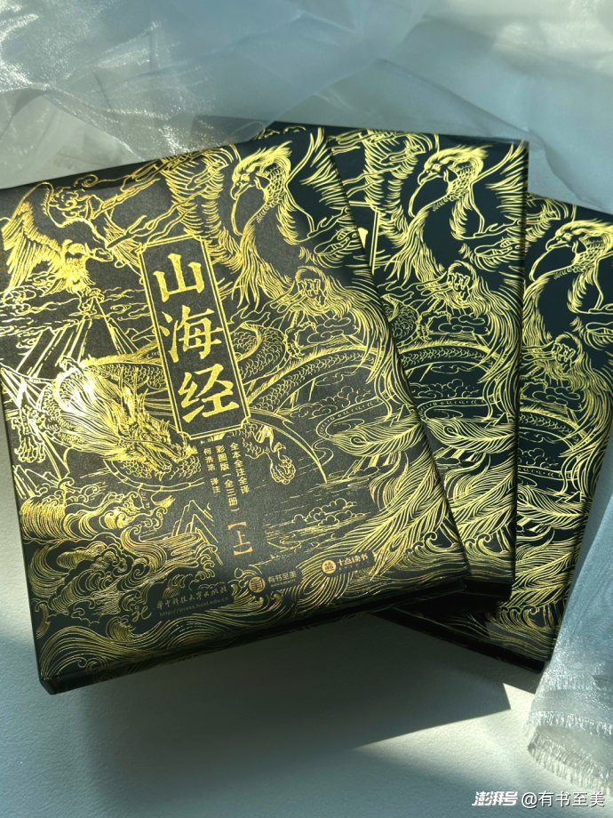 封面滿版燙金,在陽光下熠熠生輝,上面的神獸、山海紋像是在流動,奇幻感拉滿!