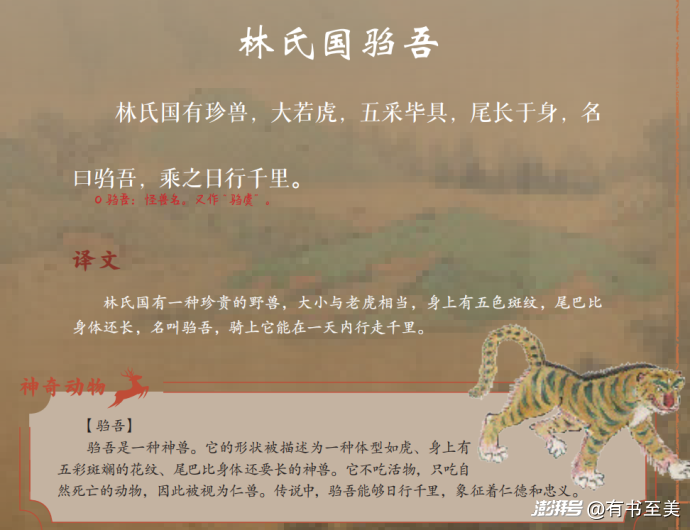 除了咱們耳熟能詳?shù)木盼埠?、精衛(wèi),書里還收錄了327種上古異獸,比如《神奇動物在哪里》的“大貓”騶吾。