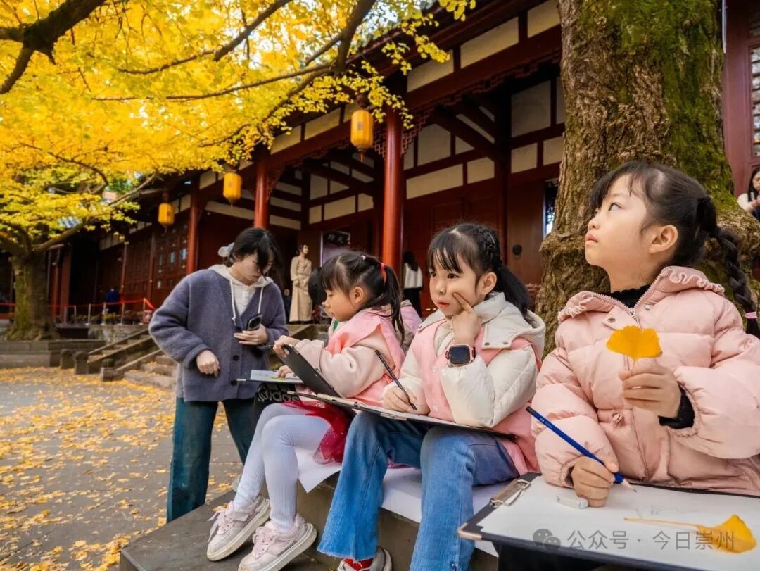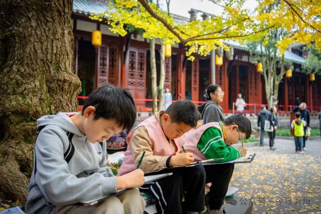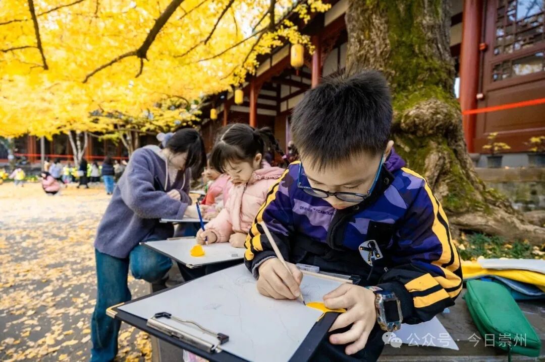 銀杏樹下,老師正帶著小朋友們寫生,他們握著鉛筆的手時而疾速涂抹,時而抬頭觀察,試圖將那參天的巨樹和滿地的金黃收于一方畫紙之上。