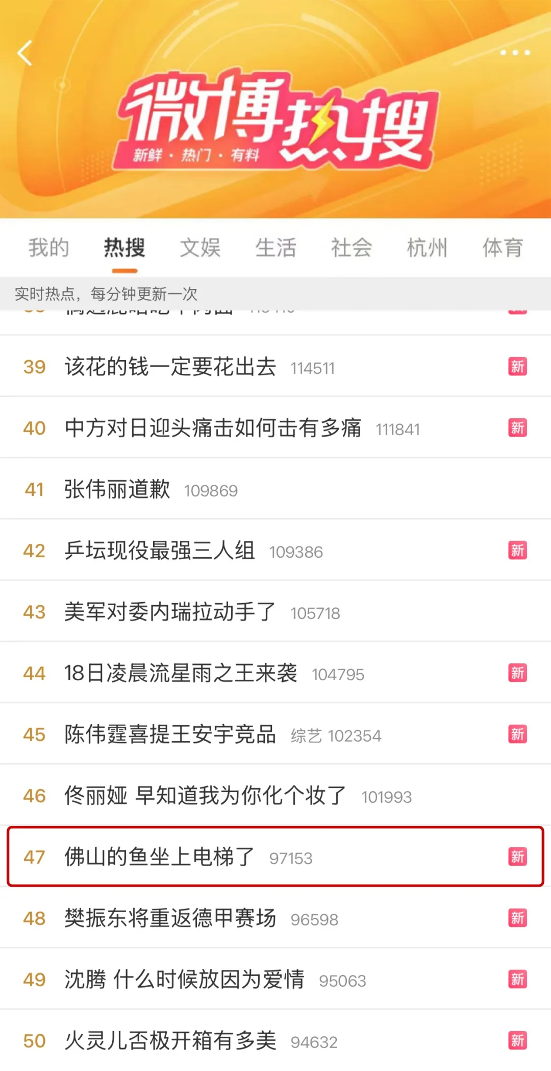 節(jié)目播出當晚,該片段#佛山的魚坐上電梯了#登上微博熱搜主榜。