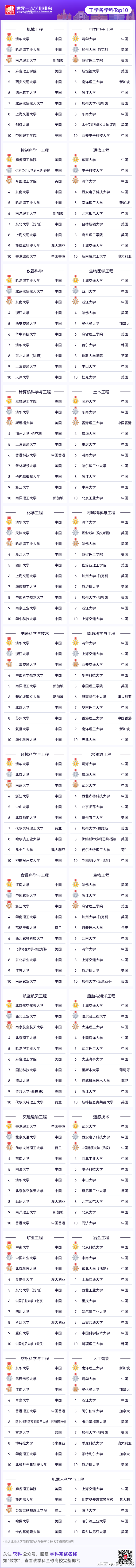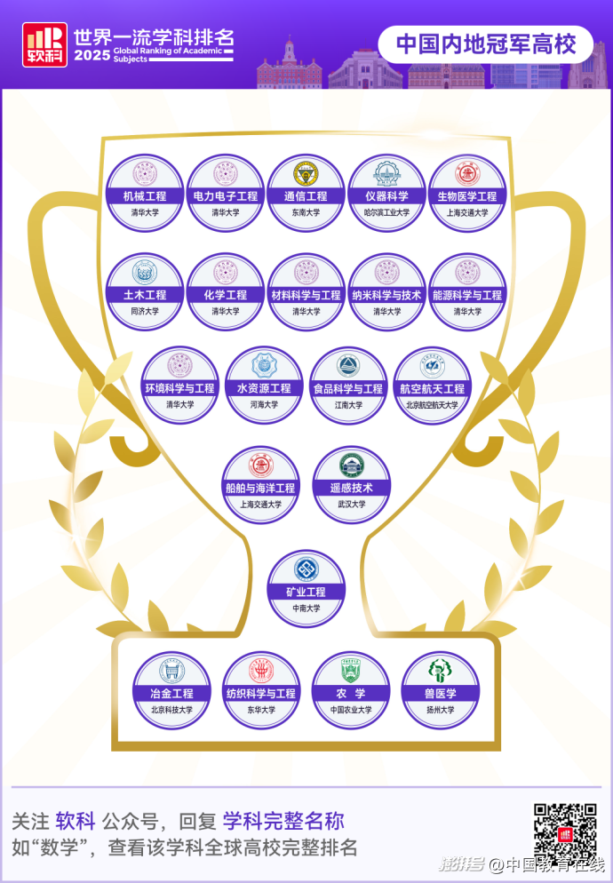 2025軟科世界一流學(xué)科排名中,中國內(nèi)地高校在電力電子工程、生物醫(yī)學(xué)工程、材料科學(xué)與工程3個學(xué)科首度問鼎世界第一,使得中國內(nèi)地高校的全球冠軍學(xué)科增加到21個。分別是清華大學(xué)(機械工程、電力電子工程、化學(xué)工程、材料科學(xué)與工程、納米科學(xué)與技術(shù)、能源科學(xué)與工程、環(huán)境科學(xué)與工程)、上海交通大學(xué)(生物醫(yī)學(xué)工程、船舶與海洋工程)、東南大學(xué)(通信工程)、哈爾濱工業(yè)大學(xué)(儀器科學(xué))、同濟(jì)大學(xué)(土木工程)、河海大學(xué)(水資源工程)、江南大學(xué)(食品科學(xué)與工程)、北京航空航天大學(xué)(航空航天工程)、武漢大學(xué)(遙感技術(shù))、中南大學(xué)(礦業(yè)工程)、北京科技大學(xué)(冶金工程)、東華大學(xué)(紡織科學(xué)與工程)、中國農(nóng)業(yè)大學(xué)(農(nóng)學(xué))、揚州大學(xué)(獸醫(yī)學(xué))。其中,揚州大學(xué)首次擁有全球冠軍學(xué)科。