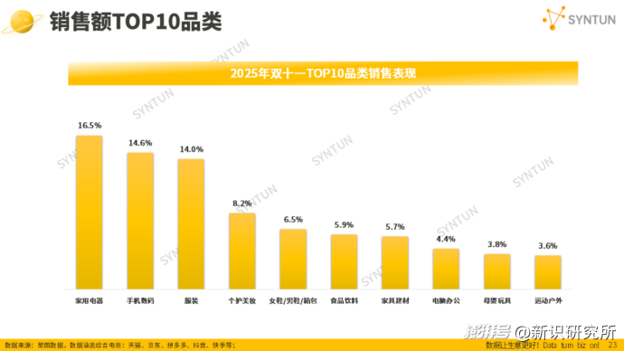 據(jù)星圖數(shù)據(jù)顯示,2025雙十一購物節(jié)類目占比排名為,家用電器占據(jù)16.5%的市場份額位列第一,緊隨其后的是手機(jī)數(shù)碼和服裝類目,分別占據(jù)14.6%和14%的市場份額,其余類目包括個(gè)護(hù)美妝、女鞋/男鞋/箱包、家具建材等等。