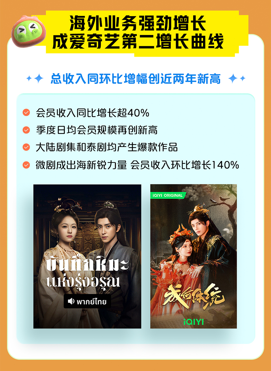 大陸劇集的全球影響力持續(xù)提升,總收入實現(xiàn)同環(huán)比雙位數(shù)增長。泰語配音版《朝雪錄》的播放時長和收入峰值均刷新了愛奇藝國際版泰語配音劇集的紀錄,并登頂13個市場的熱度榜單。本土化內(nèi)容制作同樣表現(xiàn)出色,泰語劇集《靈魂重生》成為2025年現(xiàn)象級作品,會員收入創(chuàng)下愛奇藝國際版泰劇紀錄,并登頂谷歌和推特(X)相關(guān)榜單。微劇成為出海新銳力量,由微劇帶來的會員收入環(huán)比增長140%,愛奇藝自制微劇《成何體統(tǒng)》在海外展現(xiàn)優(yōu)異長尾效應。截至9月底,微劇在會員收入、播放時長等多個核心指標上已成為僅次于長劇集的第二大內(nèi)容類型。平臺正加速開發(fā)本土自制微劇,豐富海外內(nèi)容的供給,多部英語、泰語、韓語、印尼語項目已經(jīng)開機,預計年內(nèi)上線。