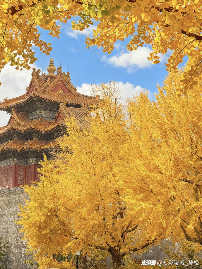 這棵銀杏就立在武英殿西北角,樹干需三人合抱,樹皮上的溝壑里還嵌著幾顆去年游人落下的祈福銅錢。它的枝椏斜斜探向重檐歇山頂,金黃的葉片與琉璃瓦的孔雀藍相互映襯,像一幅被歲月浸透的水墨畫。導游說,故宮現(xiàn)存古銀杏有四十余株,最老的幾棵多植于明清兩代,與宮殿同齡。它們不像御花園里的名貴花木被精心修剪,而是順著宮墻、挨著石階自由生長,枝丫甚至會"調(diào)皮"地伸進窗欞,仿佛要與屋內(nèi)的龍椅、書畫說些悄悄話。