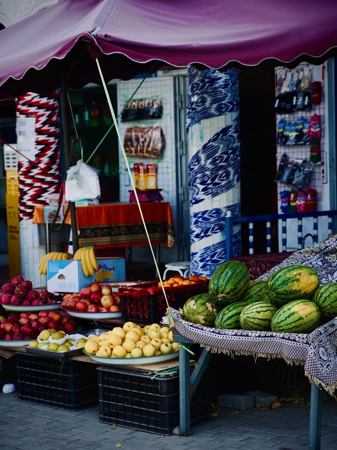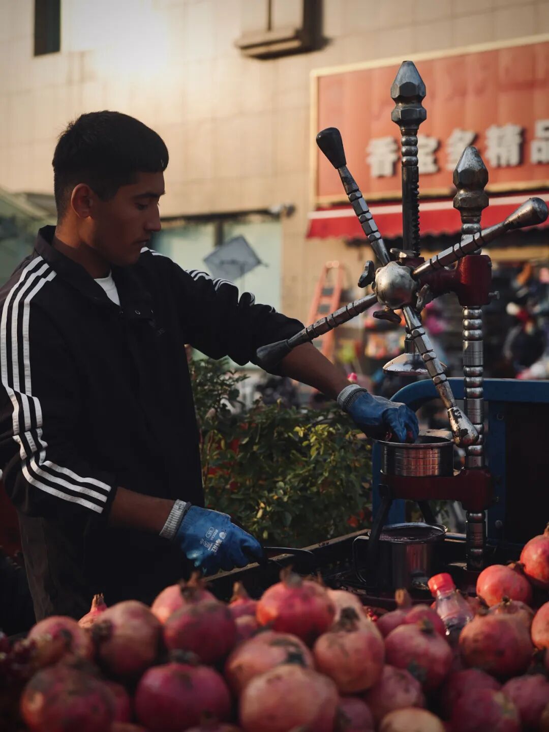 現(xiàn)榨石榴汁的攤位紅得耀眼,瓜果堆得像小山。