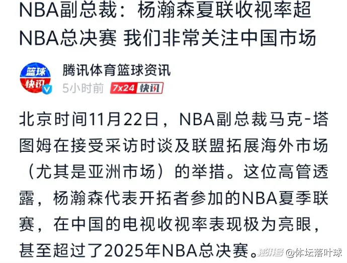 數(shù)字不會說謊。對陣灰熊的夏季聯(lián)賽僅在騰訊體育一個平臺就吸引520萬免費觀眾,這個數(shù)字遠(yuǎn)超ESPN直播狀元弗拉格首秀的110萬人。更令人震驚的是,即便需要付費觀看的比賽,仍有340萬中國球迷掏錢買單。央視轉(zhuǎn)播數(shù)據(jù)顯示,楊瀚森比賽的收視率直接碾壓了2024-25賽季NBA季后賽全部場次——要知道這僅僅是夏季聯(lián)賽,NBA全年最不受關(guān)注的賽事階段!