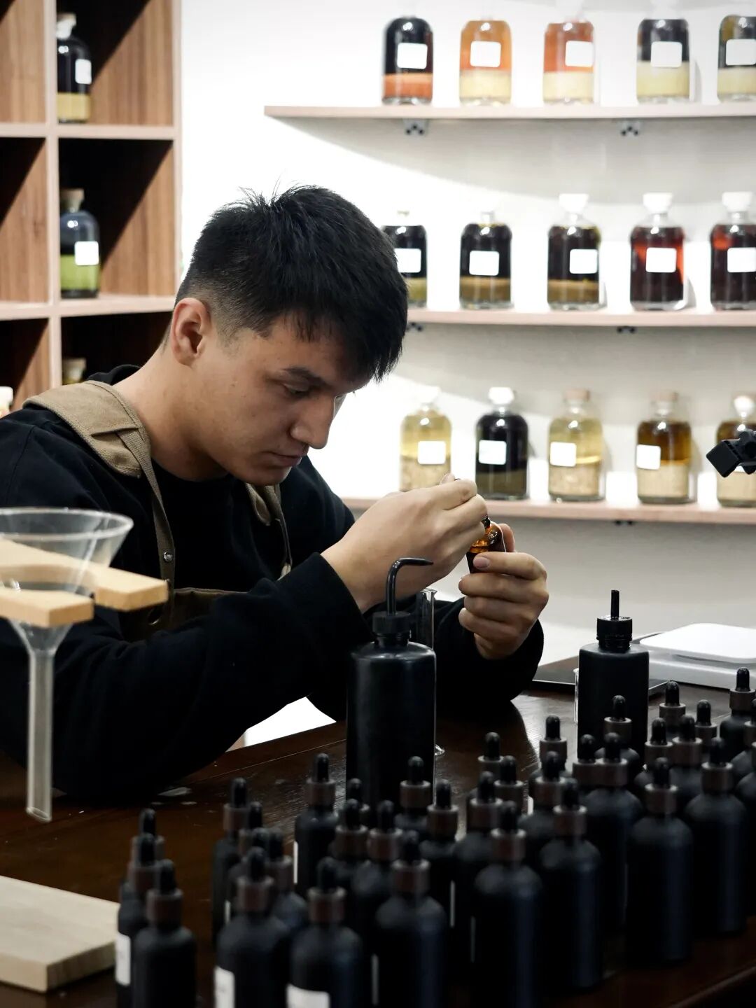 阿布說(shuō),他能調(diào)配出 500 多種香味。每一款都由他親手調(diào)配香精比例,再分裝進(jìn)純色玻璃瓶。
