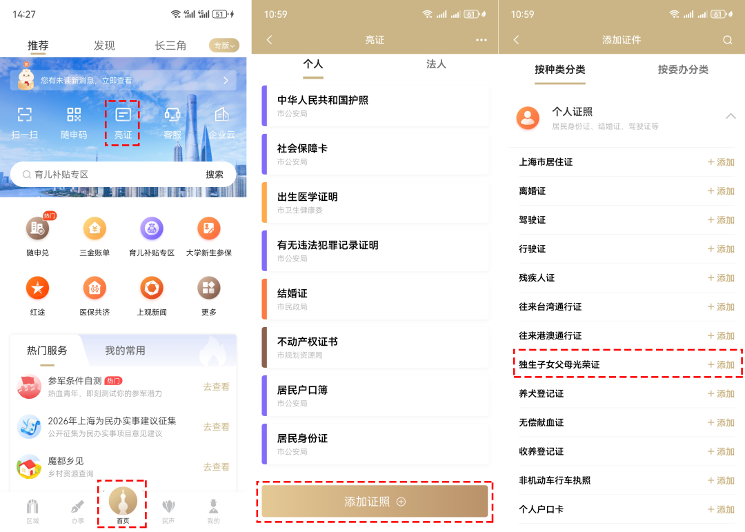 1、登錄“隨申辦市民云”APP→點(diǎn)擊首頁(yè)上方“亮證”→點(diǎn)擊“添加證照”→找到“個(gè)人證照”-“獨(dú)生子女父母光榮證”,點(diǎn)擊“添加”;