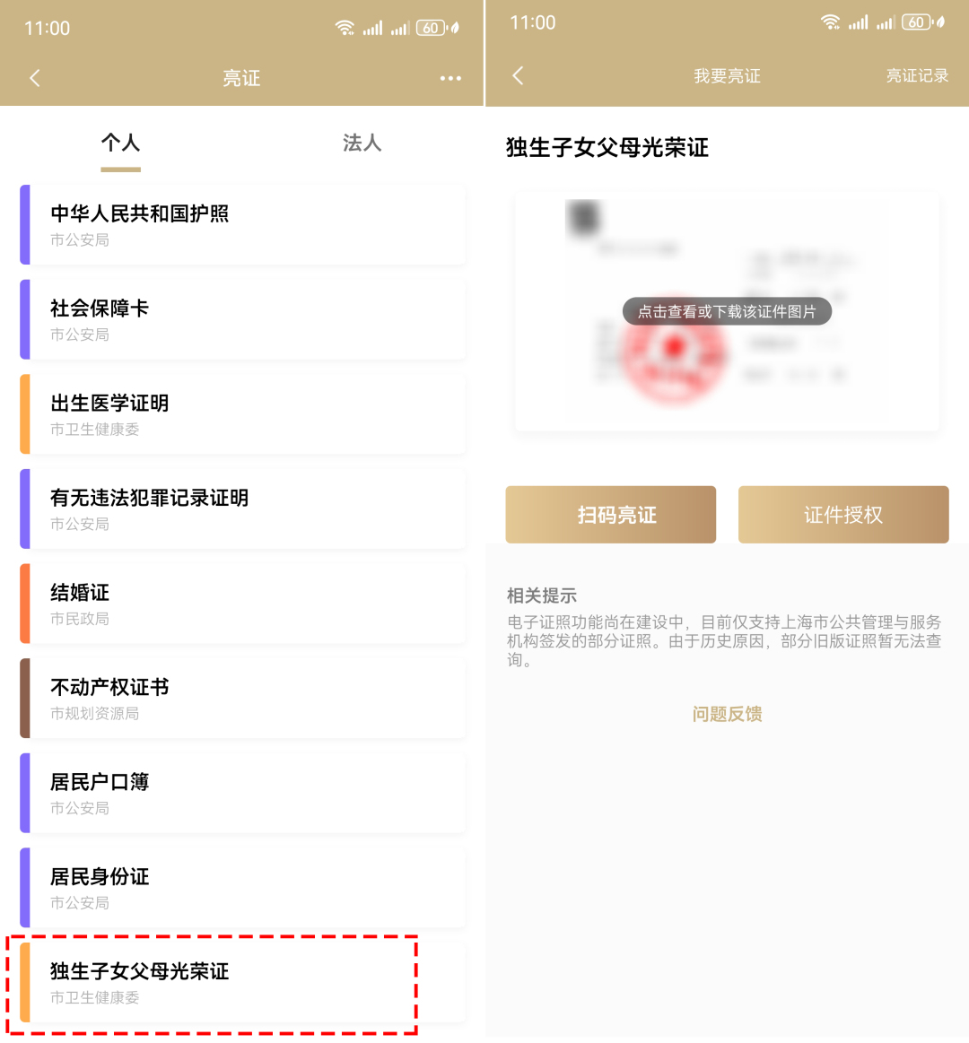 符合領(lǐng)取“獨(dú)生子女證件”的父母,可通過(guò)“隨申辦市民云”APP在線領(lǐng)取電子版“獨(dú)生子女父母光榮證”。