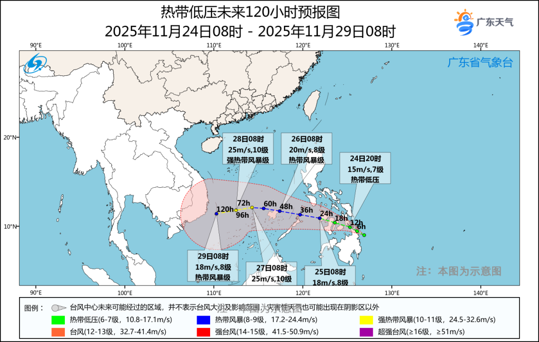 預計,該低壓將以每小時15-20公里的速度向西偏北方向移動,可能于未來24小時內(nèi)加強為今年第27號臺風,并于25日夜間進入南海南部海域,強度緩慢加強,最強可達強熱帶風暴級。由于其路徑偏南,主要影響南海中南部海面,對廣東海面和陸地無直接影響。