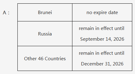 目前,中方對文萊持普通護(hù)照人員的免簽政策未設(shè)施行期限,對俄羅斯持普通護(hù)照人員的免簽政策施行至2026年9月14日,對其余46國持普通護(hù)照人員的免簽政策施行至2026年12月31日。