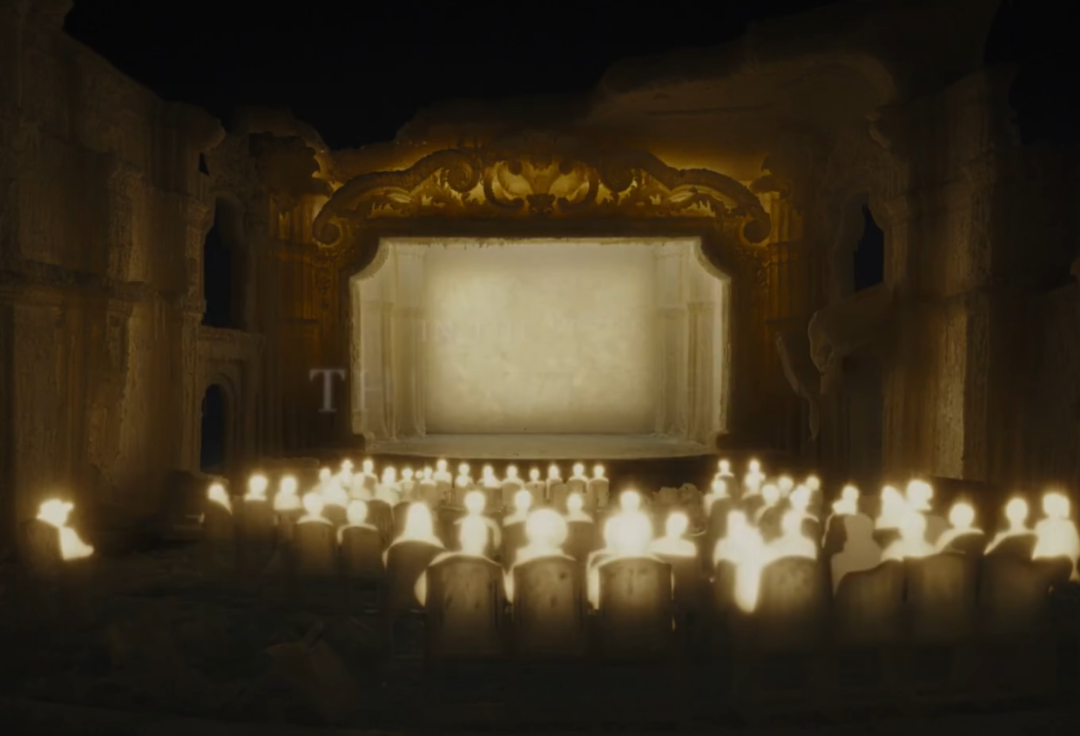 而在劇終之時,電影中的電影院曲終人散,蠟做的電影院開始融化,字幕再次出現(xiàn):“再會,縱然這場幻夢充滿苦楚!再會,縱然這場幻夢已經(jīng)崩潰!”至此,導(dǎo)演幾乎將自己想說的直白地懟到了觀眾臉上。