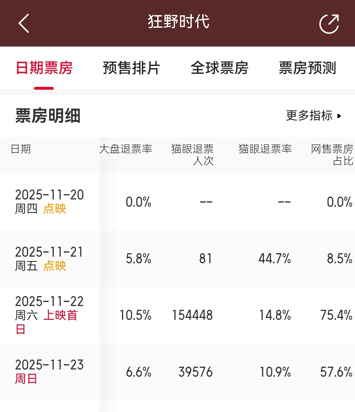 值得關(guān)注的是,該影片上市首日的退票率在個別平臺上已接近15%。據(jù)貓眼專業(yè)版,《狂野時代》上映首日(即11月22日),大盤退票人次達(dá)25.6萬,大盤退票率達(dá)10.5%;貓眼退票人次達(dá)15.4萬,貓眼退票率達(dá)14.8%。退票率和同期部分熱門影片相比,略偏高。此外,11月22日、23日該影片的網(wǎng)售票房占比分別為75.4%、57.6%,較同期熱門影片偏低。
