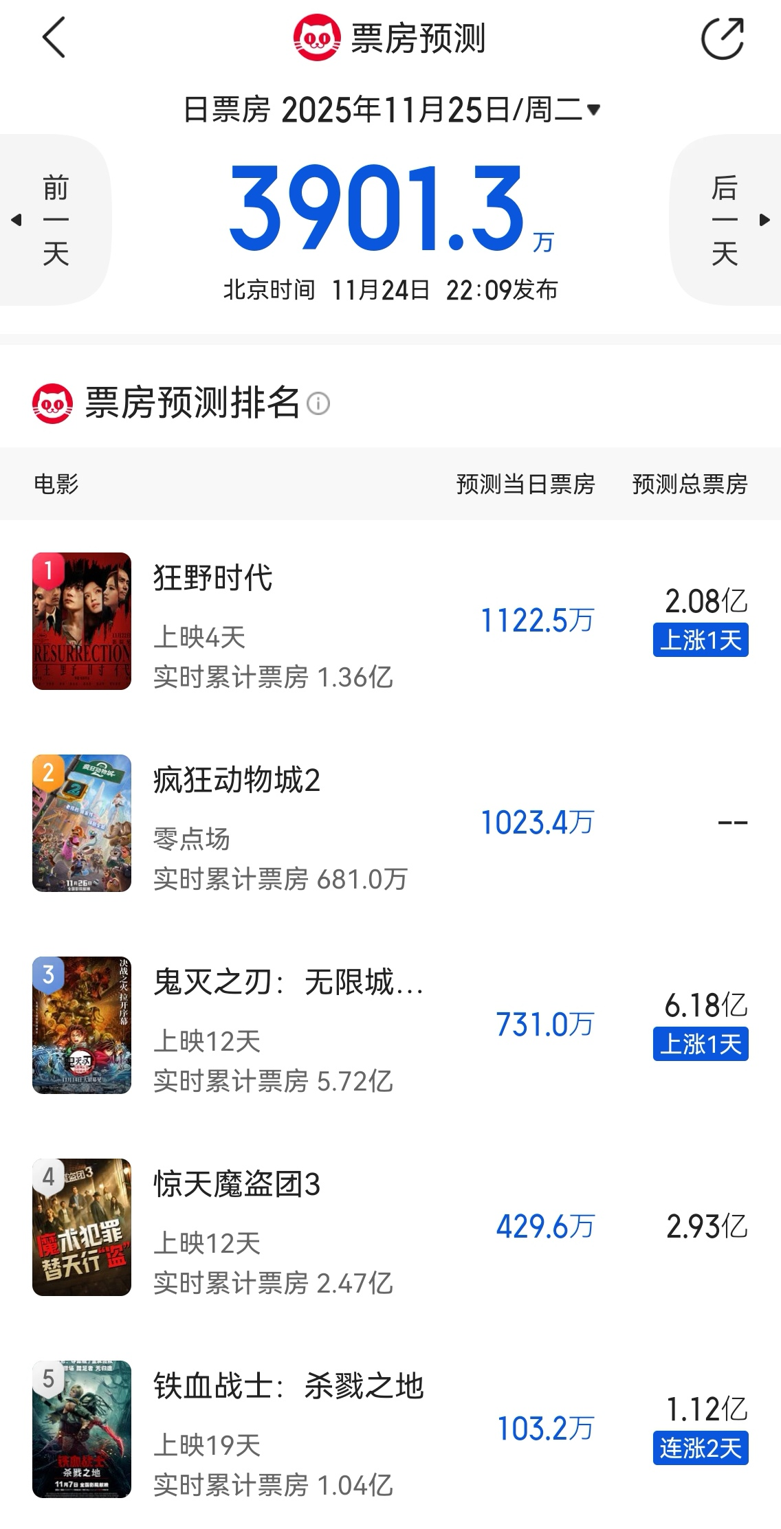 《狂野時代》于11月22日全國公映。據(jù)貓眼專業(yè)版數(shù)據(jù)顯示,該影片上映前三日票房分別為7949.78萬元、3709.53萬元、1269.32萬元。截至11月25日8時,影片累計票房為1.36億元。最新預(yù)測總票房為2.08億元。
