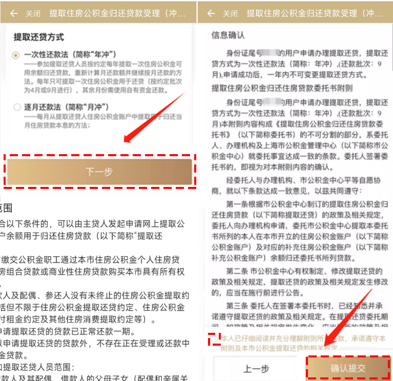 3、根據(jù)自身實(shí)際情況選擇提取還款方式,選中“一次性還款法”或“逐月還款法”按鈕后,選擇“下一步”→再次確認(rèn)信息,閱讀并勾選同意《提取住房公積金歸還住房貸款委托書附則》后,點(diǎn)擊“確認(rèn)提交”按鈕,借款人即可完成申請?zhí)峤弧?/p>