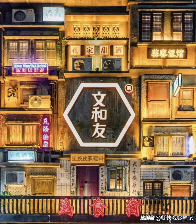 文和友是這條路徑最激進(jìn)的探索者。投資超 1 億元,打造完整的 80 年代長(zhǎng)沙街景,用近萬件老物件、本地小吃商戶和沉浸式文化場(chǎng)景,將餐廳打造成 “可以吃飯的城市博物館”—— 老式理發(fā)店、錄像廳、游戲廳、霓虹燈招牌…… 顧客平均停留時(shí)間 3-4 小時(shí),開業(yè)首月帶動(dòng)周邊商圈客流增長(zhǎng) 300%。