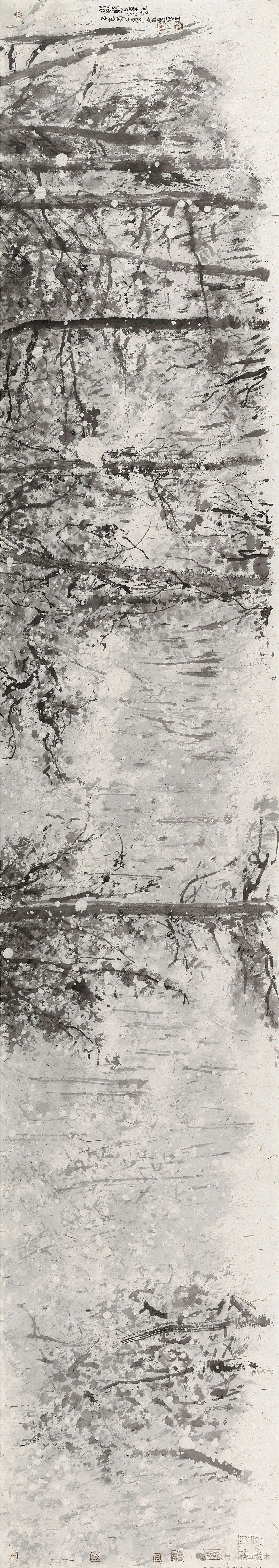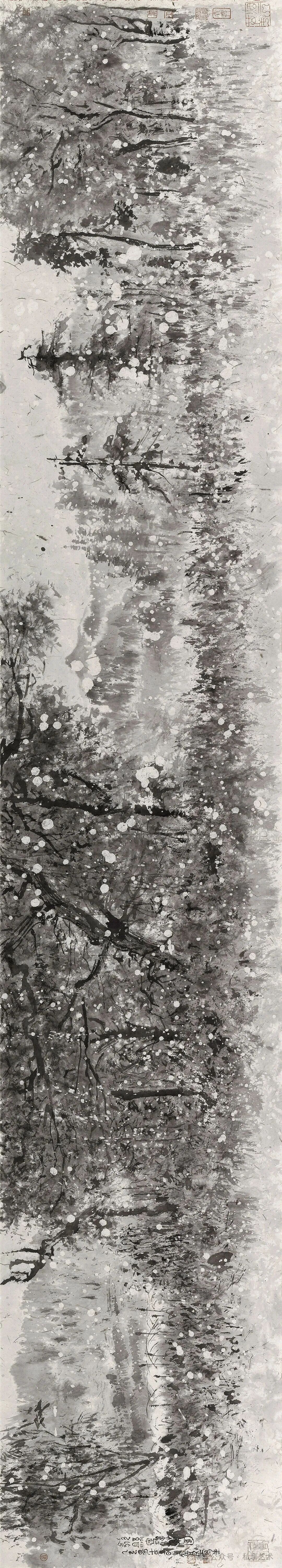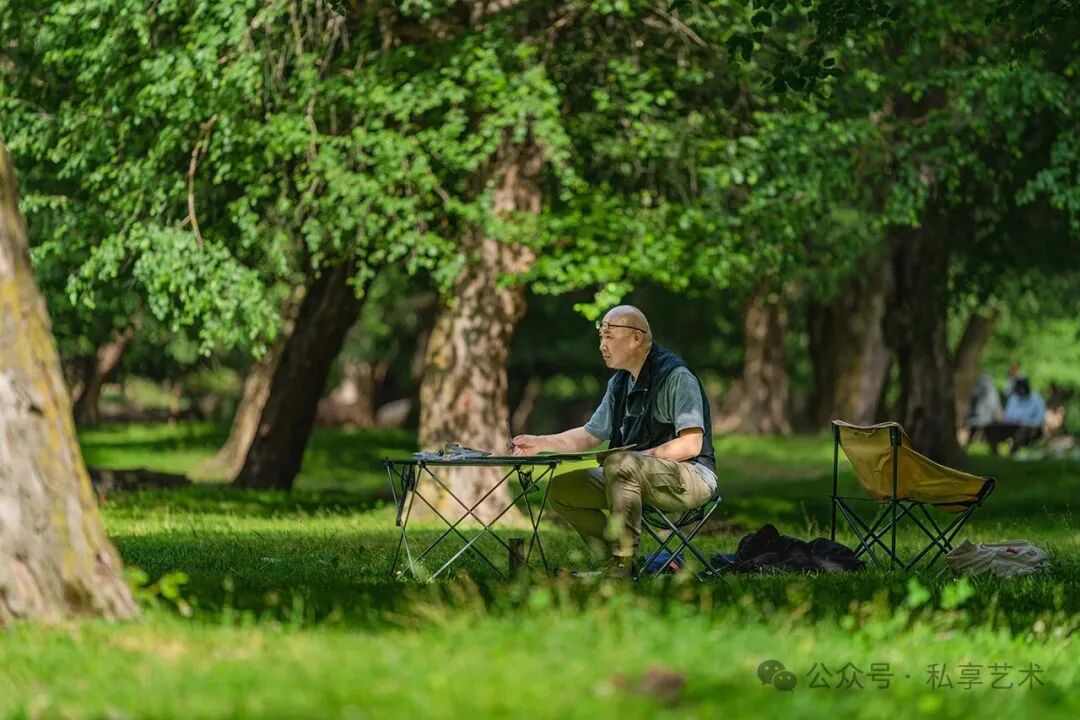 董金良的水墨寫(xiě)生,以蒼潤(rùn)筆墨織就林間意趣??莨P與潑墨相生,枝椏如游龍盤(pán)繞,墨點(diǎn)似晨露散落,既得自然肌理之真,又融書(shū)寫(xiě)性的灑脫。他把現(xiàn)場(chǎng)的光影、草木的呼吸,都凝進(jìn)黑白灰的節(jié)奏里,讓每一幅寫(xiě)生都成了水墨與自然對(duì)話(huà)的私語(yǔ)箋。