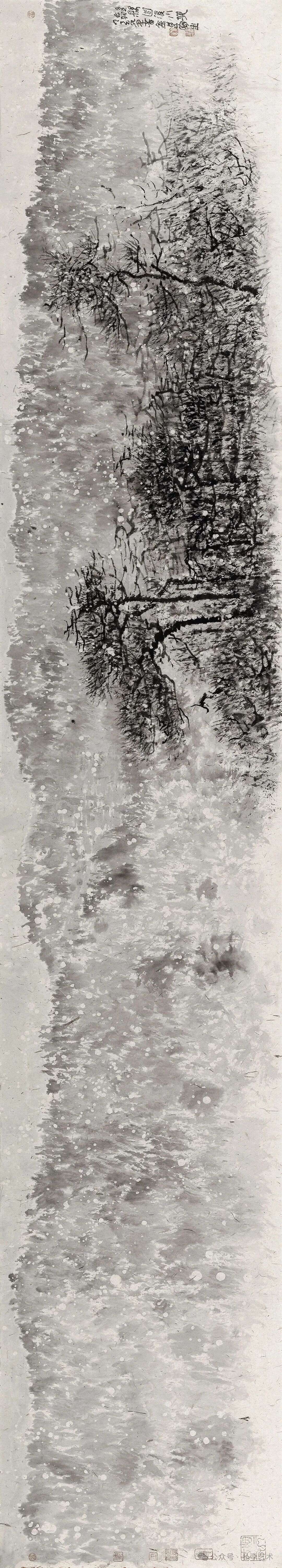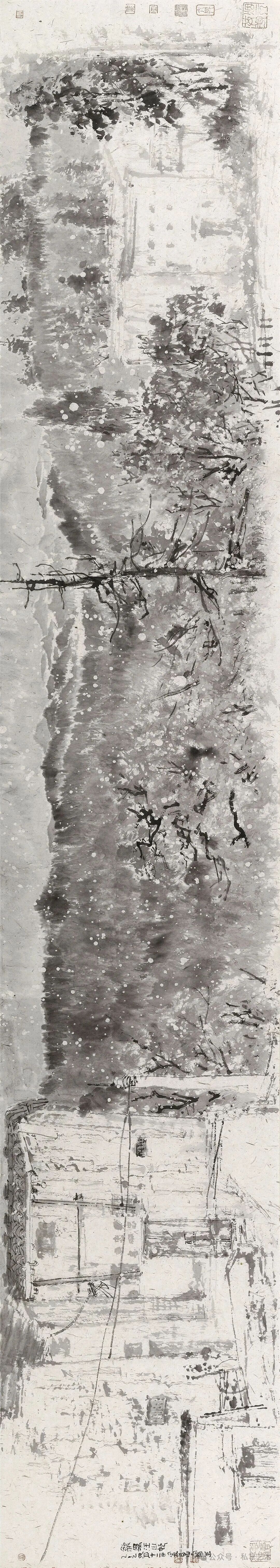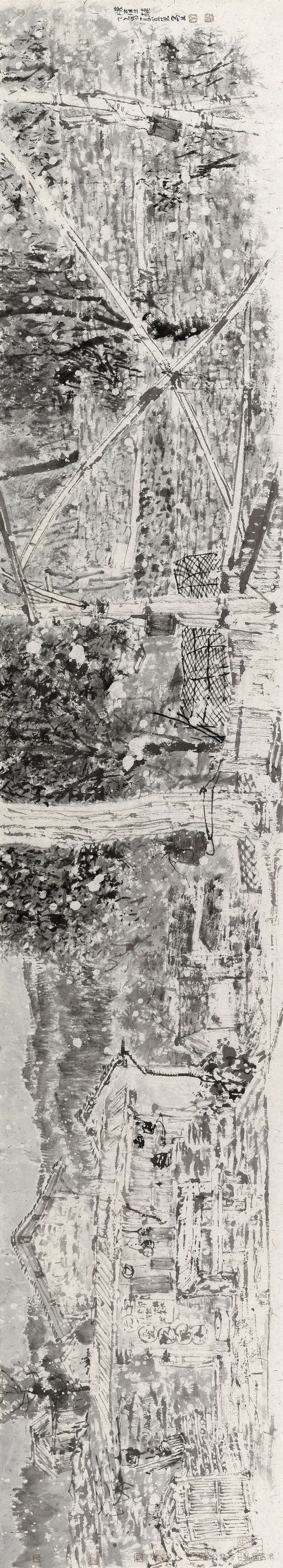 董金良的水墨寫(xiě)生,以蒼潤(rùn)筆墨織就林間意趣??莨P與潑墨相生,枝椏如游龍盤(pán)繞,墨點(diǎn)似晨露散落,既得自然肌理之真,又融書(shū)寫(xiě)性的灑脫。他把現(xiàn)場(chǎng)的光影、草木的呼吸,都凝進(jìn)黑白灰的節(jié)奏里,讓每一幅寫(xiě)生都成了水墨與自然對(duì)話(huà)的私語(yǔ)箋。