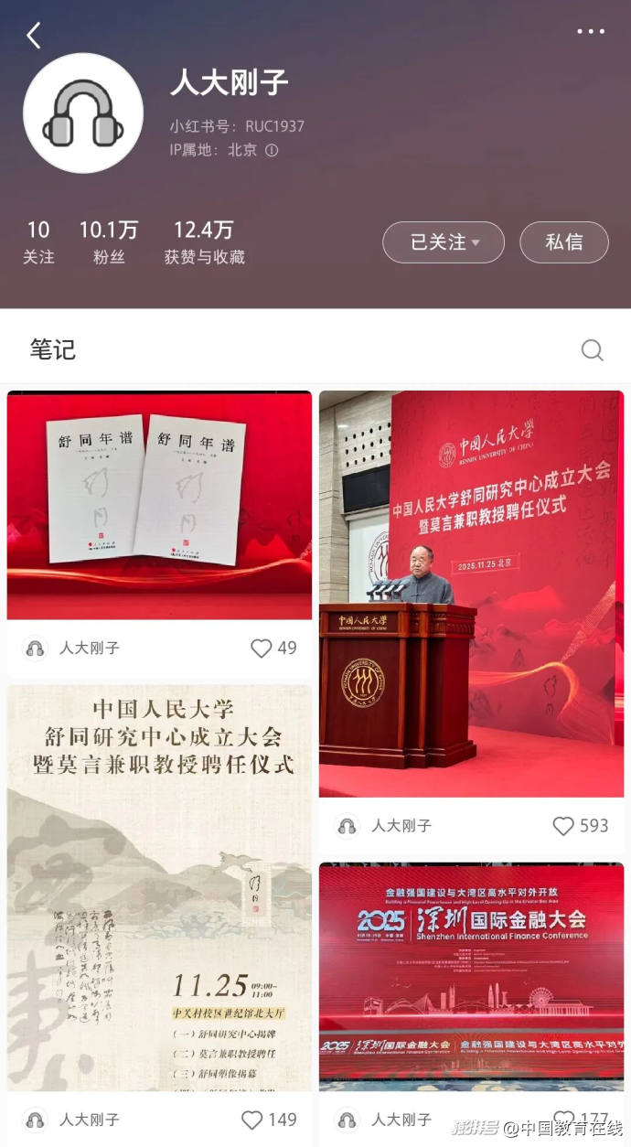 據(jù)中國人民大學(xué)黨委書記張東剛的小紅書賬號“人大剛子”消息,11月25日,中國人民大學(xué)舒同研究中心成立大會暨莫言兼職教授聘任儀式舉行。