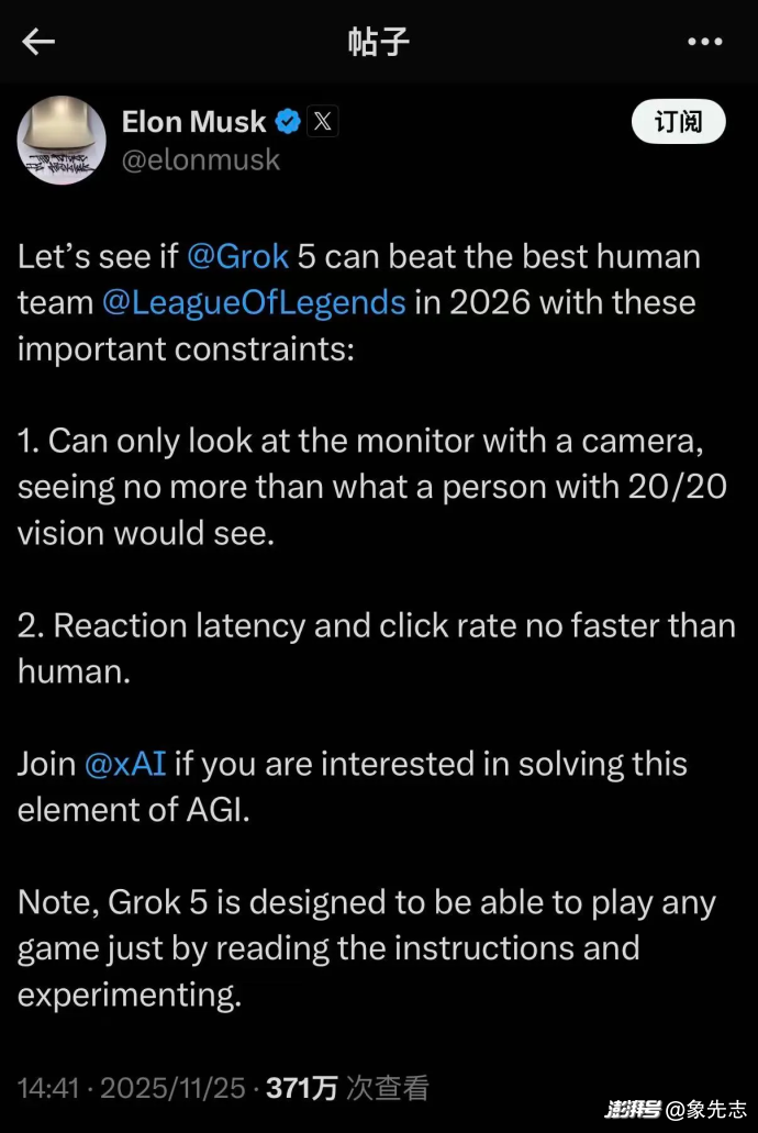 11月 25 日,馬斯克在 X 上發(fā)布了一則“挑戰(zhàn)書(shū)”,要讓 Grok5 在英雄聯(lián)盟游戲中挑戰(zhàn)人類頂尖戰(zhàn)隊(duì),這或許是歷史上首次 AI 與人類的 5v5 的大型對(duì)線。