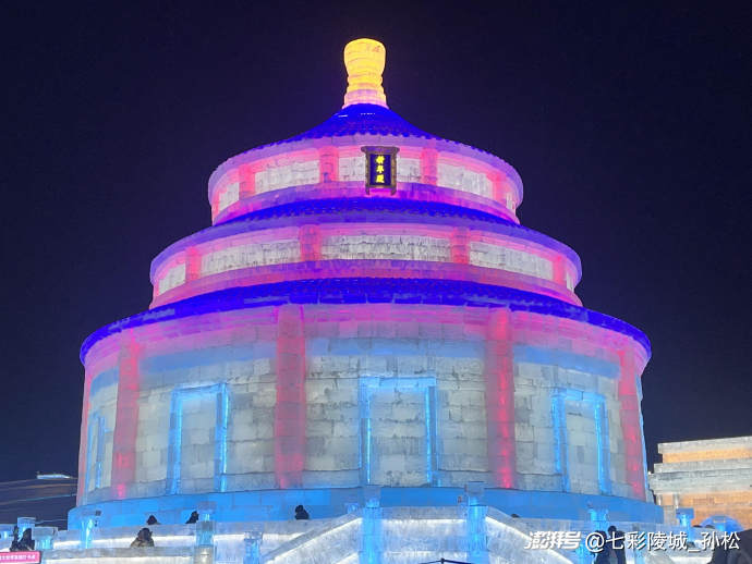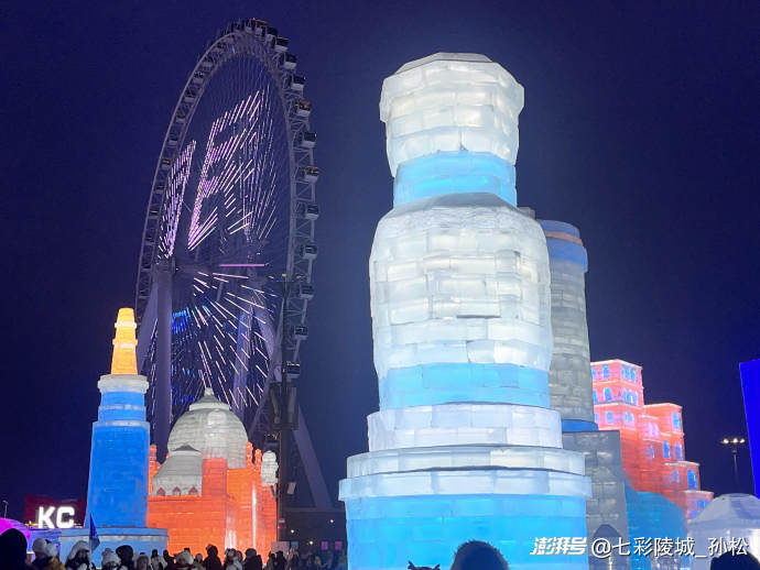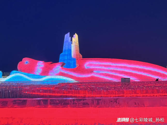 沿著主路往前走,兩邊的冰燈更是讓我挪不開眼。有的冰燈里嵌著LED燈帶,照得冰塊里的氣泡像星星一樣閃爍;有的做成巨大的雪花造型,邊緣還點綴著亮晶晶的金粉;最有趣的是一只冰雕的小企鵝,圓滾滾的肚子是淡藍(lán)色的,背上的羽毛用深藍(lán)色冰片拼成鱗片狀,站在一塊冰石頭上歪著頭看游客,活脫脫像在說:“歡迎來到我的家!