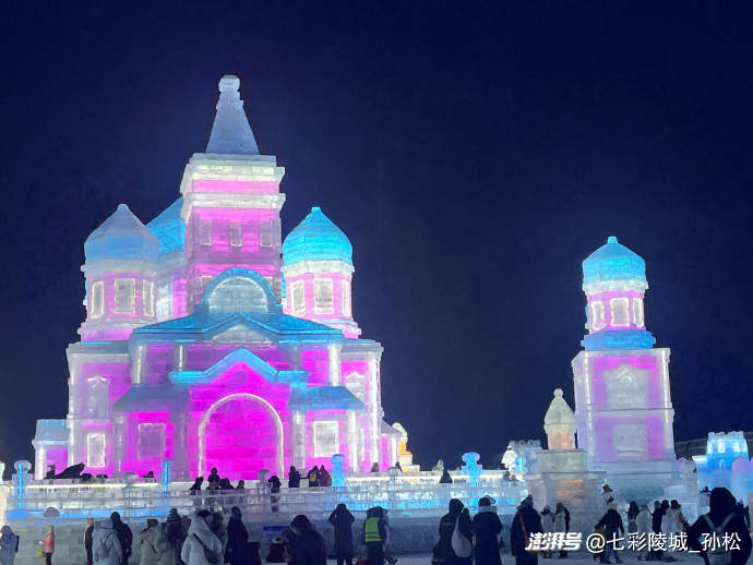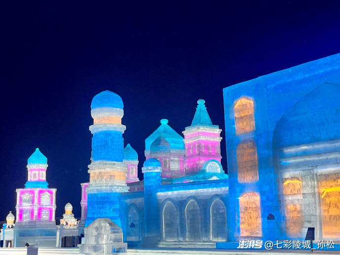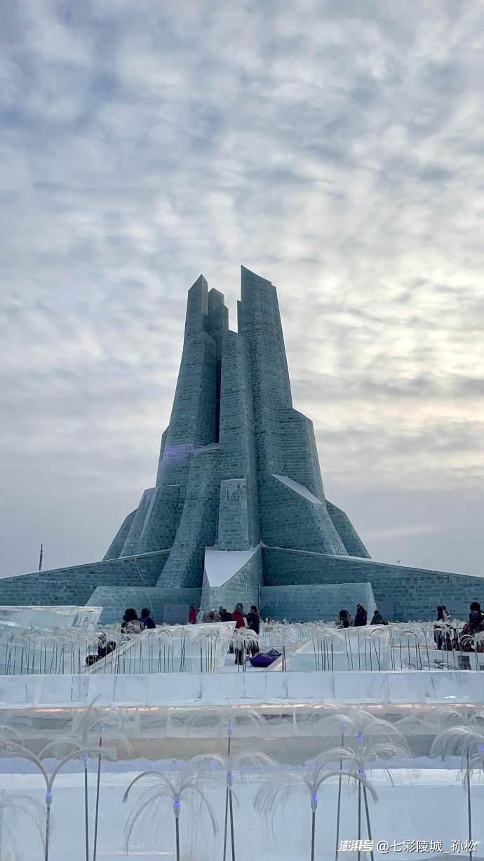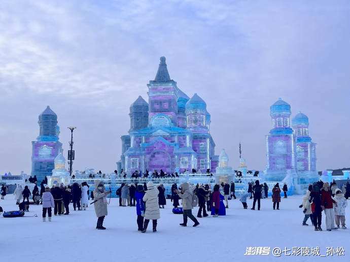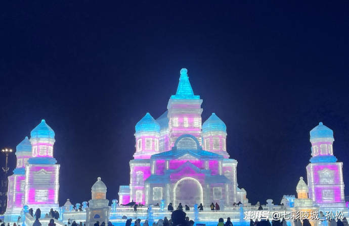 清晨的寒風(fēng)像小刀子似的刮在臉上,可當(dāng)我站在冰雪大世界的正門前,立刻被眼前的景象驚住了——一座足有五六層樓高的冰城堡矗立在眼前,城墻上的冰磚層層疊疊,在陽光下泛著淡藍(lán)和淺粉的光,像被施了魔法的寶石山。城堡頂端還立著個冰雕的公主,裙擺上垂落的“冰珠鏈”隨著風(fēng)輕輕搖晃,仿佛下一秒就要活過來似的。