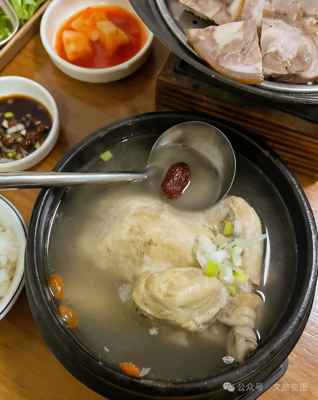 地道的參雞湯以童子雞為主食材,雞腹中填滿糯米,再加入人參、大棗、枸杞、黃芪、當(dāng)歸等中藥材,將谷物和藥材完美結(jié)合。此外,燉煮過程中不添加任何調(diào)味料,只取食材本身的味道。湯汁清澈,喝一口,清甜又滋補(bǔ)!