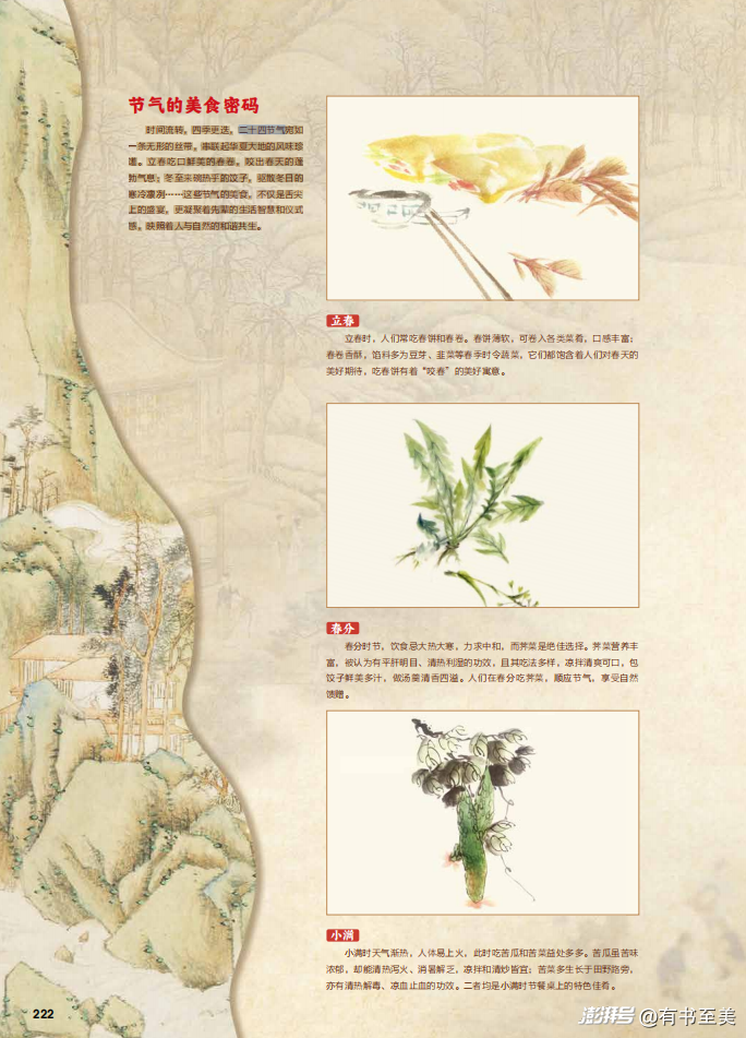 比如立春吃春餅,春分嘗薺菜,小滿來點苦瓜……甚至還貼心地介紹了做法和養(yǎng)生功效,簡直是一本“舌尖上的節(jié)氣指南”!