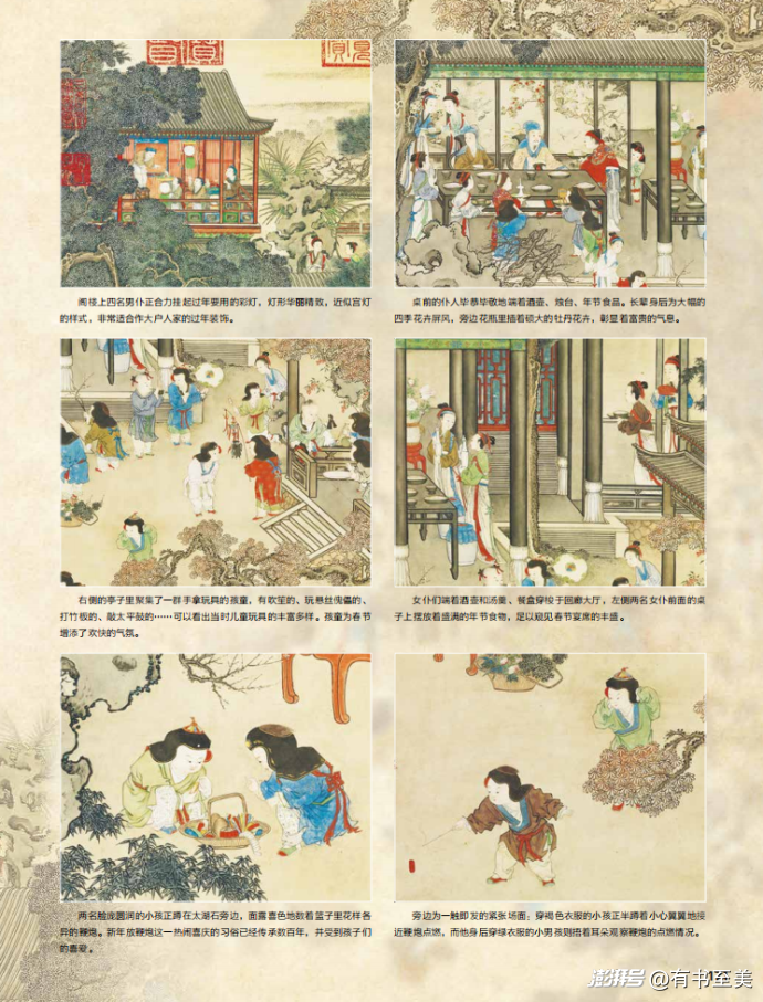 比如清代姚文瀚的《歲朝歡慶圖》,把古人過春節(jié)的熱鬧場景全畫下來了。書中還把畫中細節(jié)一一放大:閣樓上掛彩燈、院子里小孩吹笙、打竹板、敲太平鼓、放鞭炮……春節(jié)習俗一目了然,小朋友看這幅畫肯定感覺特別親切!