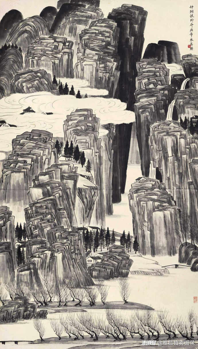逾1200件精品佳構(gòu)分列五大專場,堪稱寰宇征集的巔峰之選?!按笥^”夜場群星閃耀,傅抱石《巴山夜雨》墨氣淋漓,于混沌中見光明,是其金剛坡時期筆墨革新的典范之作,自存珍愛盡顯匠心;齊白石《致曹錕云山深澗》氣象雄渾,作為遠(yuǎn)游寫生集大成之作,筆鋒獨樹一幟,見證布衣畫家與北洋大帥的跨界交集;張大千《仿王蒙江山雪霽圖》為津門富賈范竹齋舊藏,神龍首現(xiàn)的仿古巨制,盡展大千壯歲盛期的筆墨風(fēng)骨。