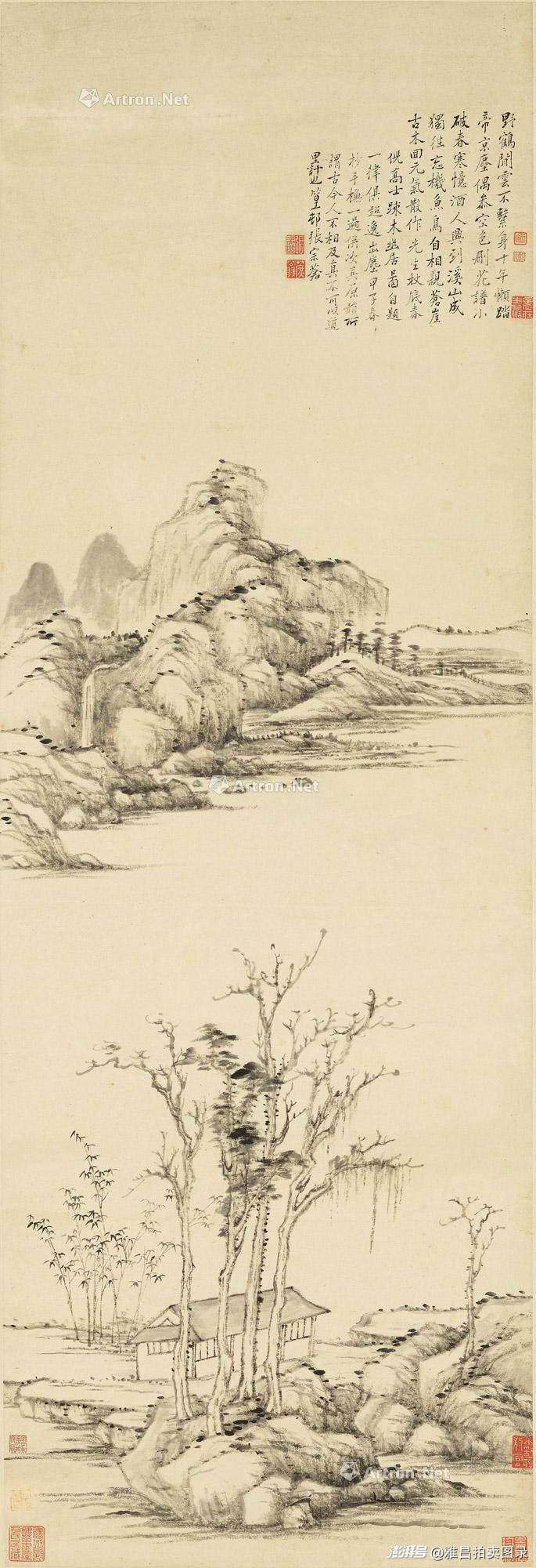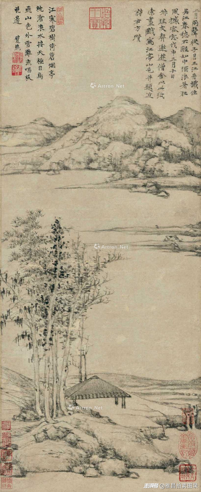 畫中構圖屬于倪家山水常見的一河兩岸,近岸坡石上前后繪高樹五六株,品類不一,樹下畫小亭一座。畫面左方有“躄樵”謝常題詩一首,謝氏元末明初吳江人,受業(yè)于楊維禎,隱居震澤。至清初有笪重光、王鴻緒諸家收藏,清中期為怡親王弘曉所寶,至近代為王季遷得于美洲,自上世紀中期以來,出版、展覽十數(shù)種,為海內知名倪云林畫跡,至可珍寶。
