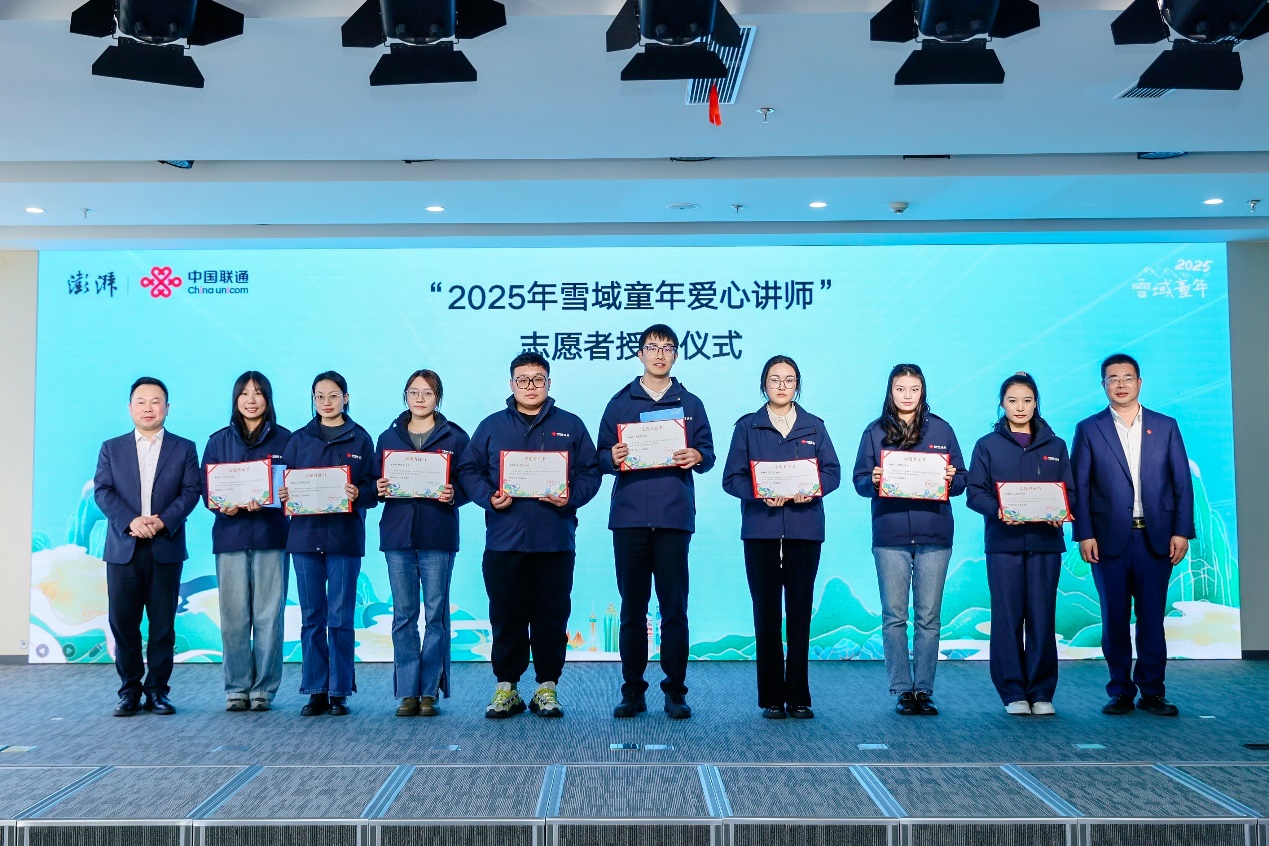 澎湃新聞總裁、總編輯劉永鋼與上海聯(lián)通黨委委員、副總經(jīng)理歐大春共同為志愿者代表們授予“2025年雪域童年愛心講師”榮譽(yù)牌。