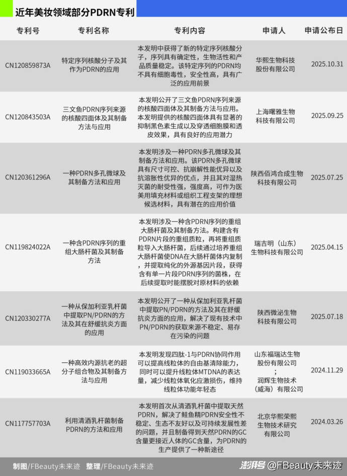 例如,不久前,國(guó)家知識(shí)產(chǎn)權(quán)局公布了華熙生物申請(qǐng)的《特定序列核酸分子及其作為PDRN的應(yīng)用》專利。在成分制備工藝層面,華熙生物開發(fā)了一種具有特定序列PDRN合成方法,可解決天然風(fēng)險(xiǎn)來源PDRN可能攜帶病原體的風(fēng)險(xiǎn),并解決了不同批次間質(zhì)量差異問題。