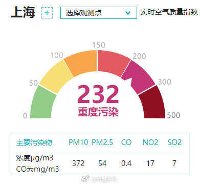 上海、嘉興、湖州一帶PM10濃度上升,上海已達(dá)重度污染