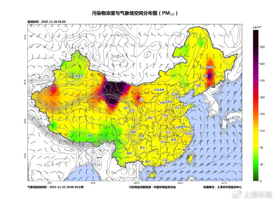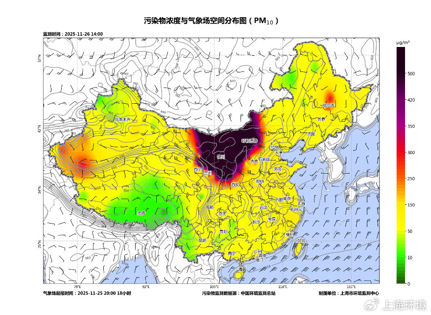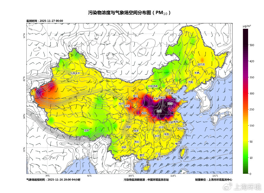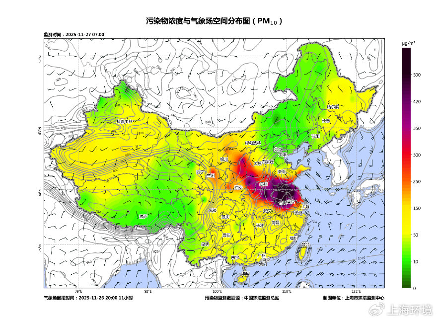 ??25日,蒙古國、內(nèi)蒙古、甘肅、寧夏等地出現(xiàn)沙塵天氣,PM10峰值濃度超過2000微克/立方米,達(dá)嚴(yán)重污染水平;26日夜間,在冷空氣作用下,沙塵污染傳輸至長三角區(qū)域,當(dāng)前27日7時(shí),蘇皖魯豫地區(qū)出現(xiàn)PM10重度至嚴(yán)重污染,峰值濃度超過600微克/立方米。