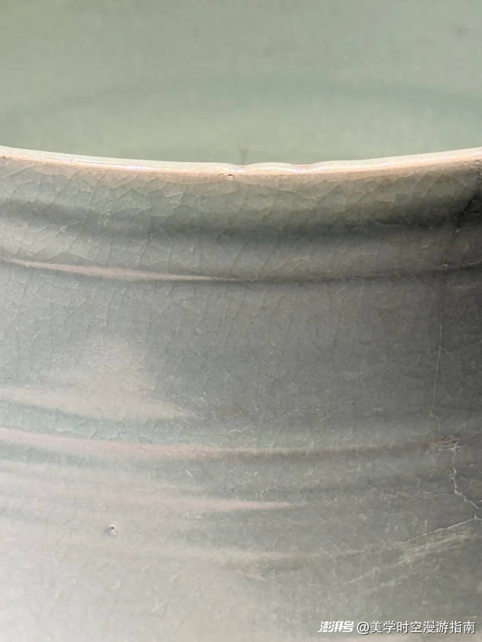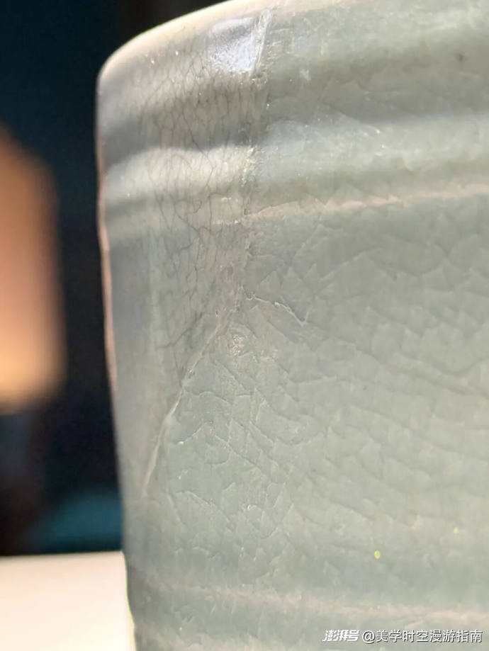 我們故宮博物館還有一件不能出境的汝窯淡天青釉弦紋三足樽式爐,開片也極漂亮。在本文開頭是我放的音頻,那就是瓷釉開片的聲音,是當(dāng)代的瓷器出窯冷卻錄下來的。那是它在用永恒的時光緩慢綻放。