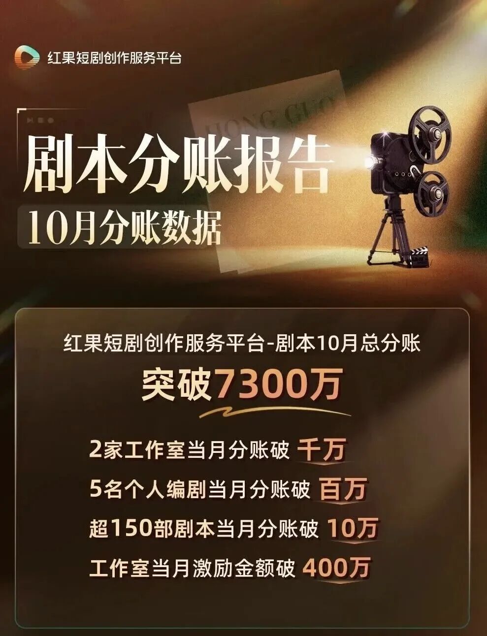 幫助新人入行后,平臺也在思考如何讓好的創(chuàng)作獲得合理的回報。紅果短劇先后推出了編劇和演員的分賬機制,讓創(chuàng)作者的收入與作品的市場表現(xiàn)直接掛鉤,且可在作品上線后持續(xù)獲得收益。紅果還多次上調(diào)劇本合作的保底和分成比例,讓激勵梯度更具區(qū)分度。以10月份為例,紅果短劇創(chuàng)作服務(wù)平臺當月劇本總分賬破7000萬元。