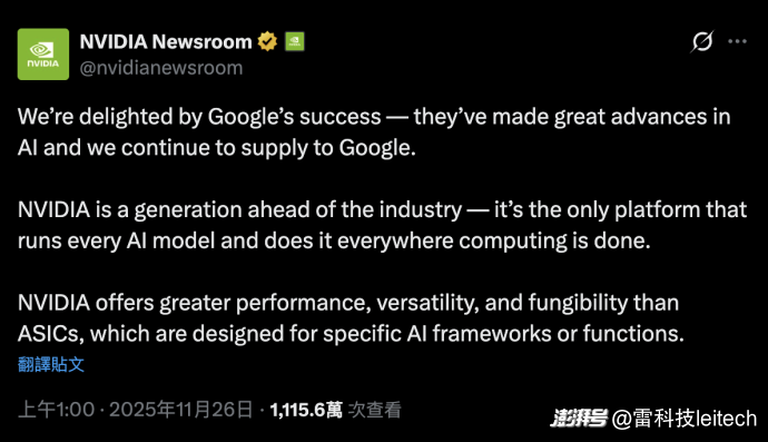 不單如此,Gemini 3 也徹底了扭轉(zhuǎn)「Google 掉隊(duì)論」,自研 TPU 也被視為英偉達(dá)算力霸權(quán)的最大變量,Meta 都被傳出正評(píng)估大規(guī)模采購(gòu) TPU,直接讓英偉達(dá)股價(jià)下跌近 7%,隨后英偉達(dá)官方也在 X(原 Twitter)上發(fā)文稱(chēng):