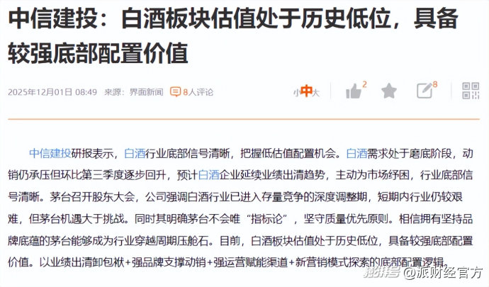 中信建投研報(bào)表示,白酒行業(yè)底部信號(hào)清晰,把握低估值配置機(jī)會(huì)。