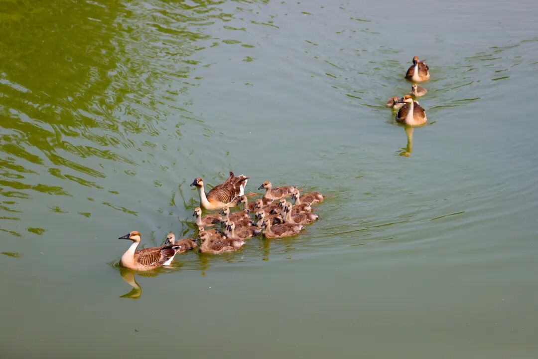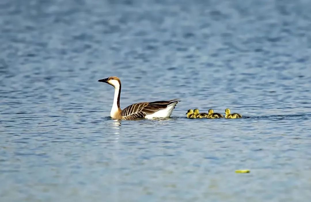 △鴻雁帶著小寶寶在水中游弋。資料圖