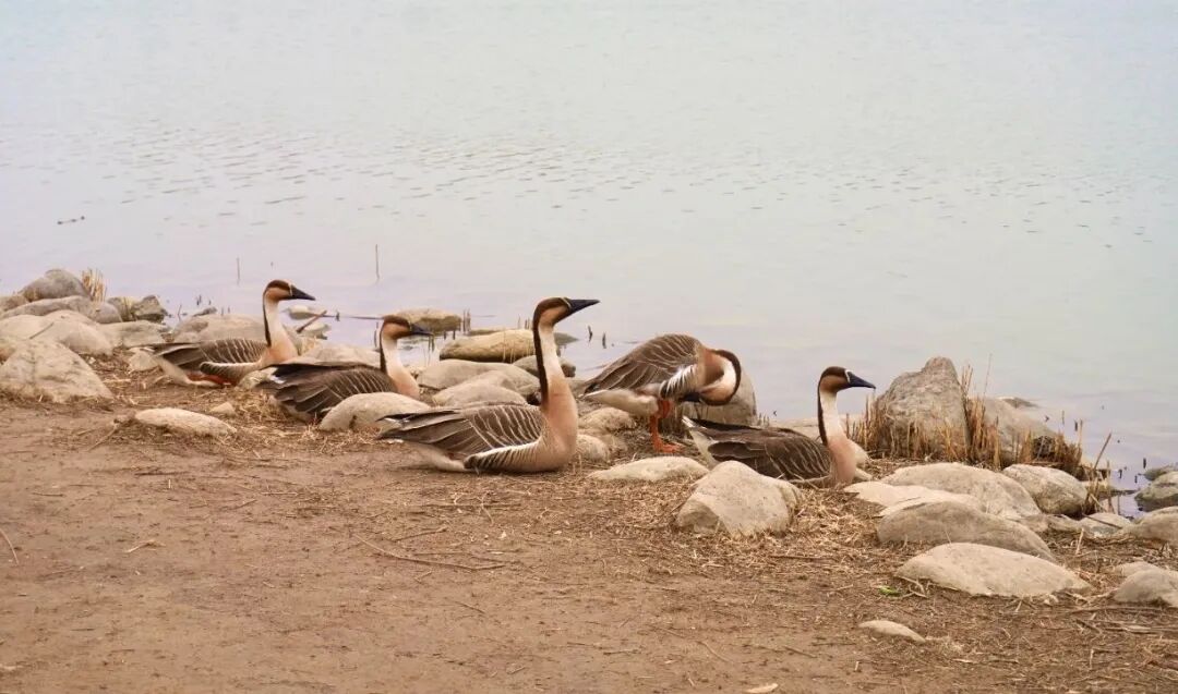 △成群的鴻雁在水邊休憩。資料圖