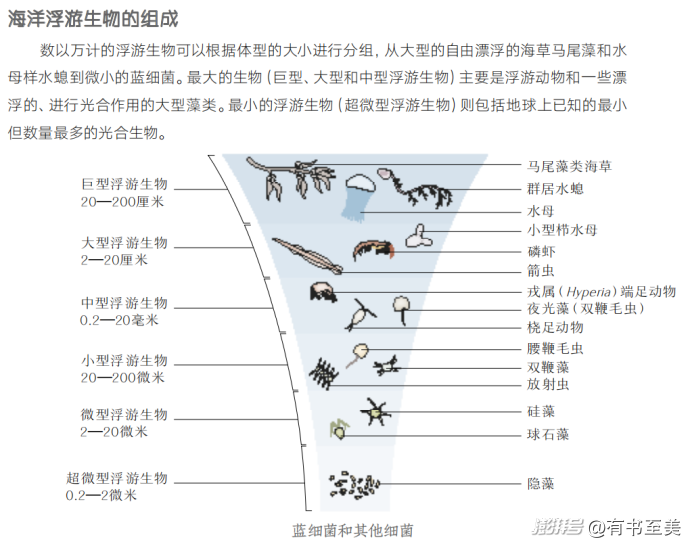 這張圖展示了海洋浮游生物的組成,并且呈漏斗狀,表示體型逐次遞減。