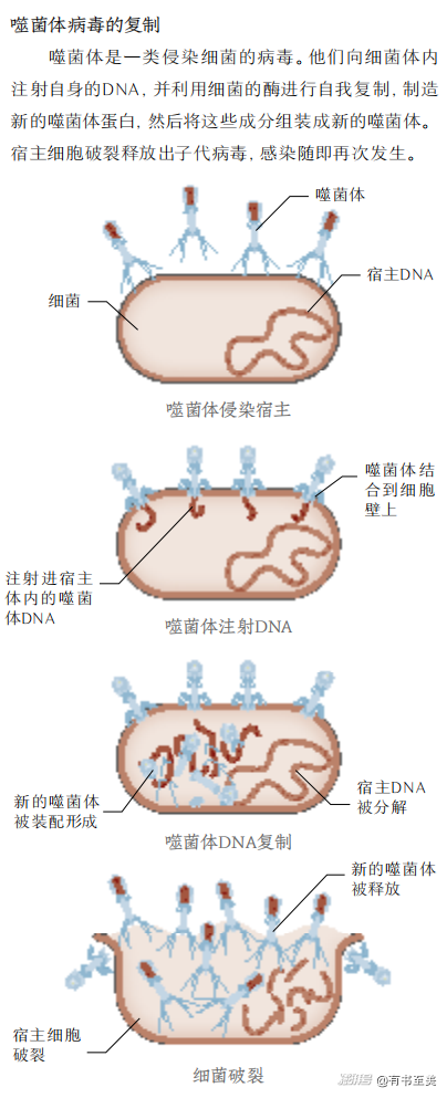 這張圖展現(xiàn)了病毒如何入侵細(xì)胞,利用細(xì)胞進(jìn)行自我復(fù)制,最終殺死細(xì)胞的。