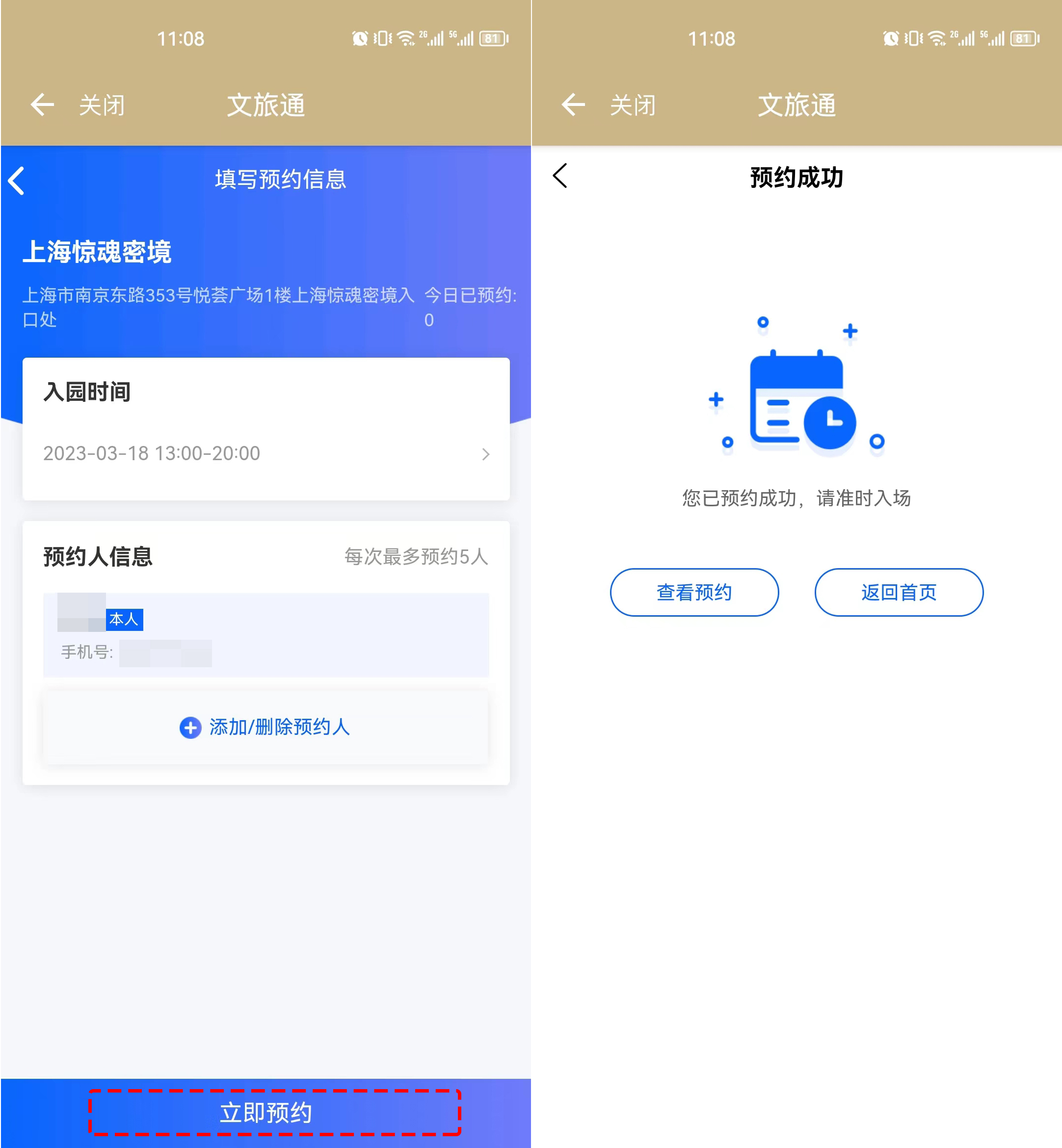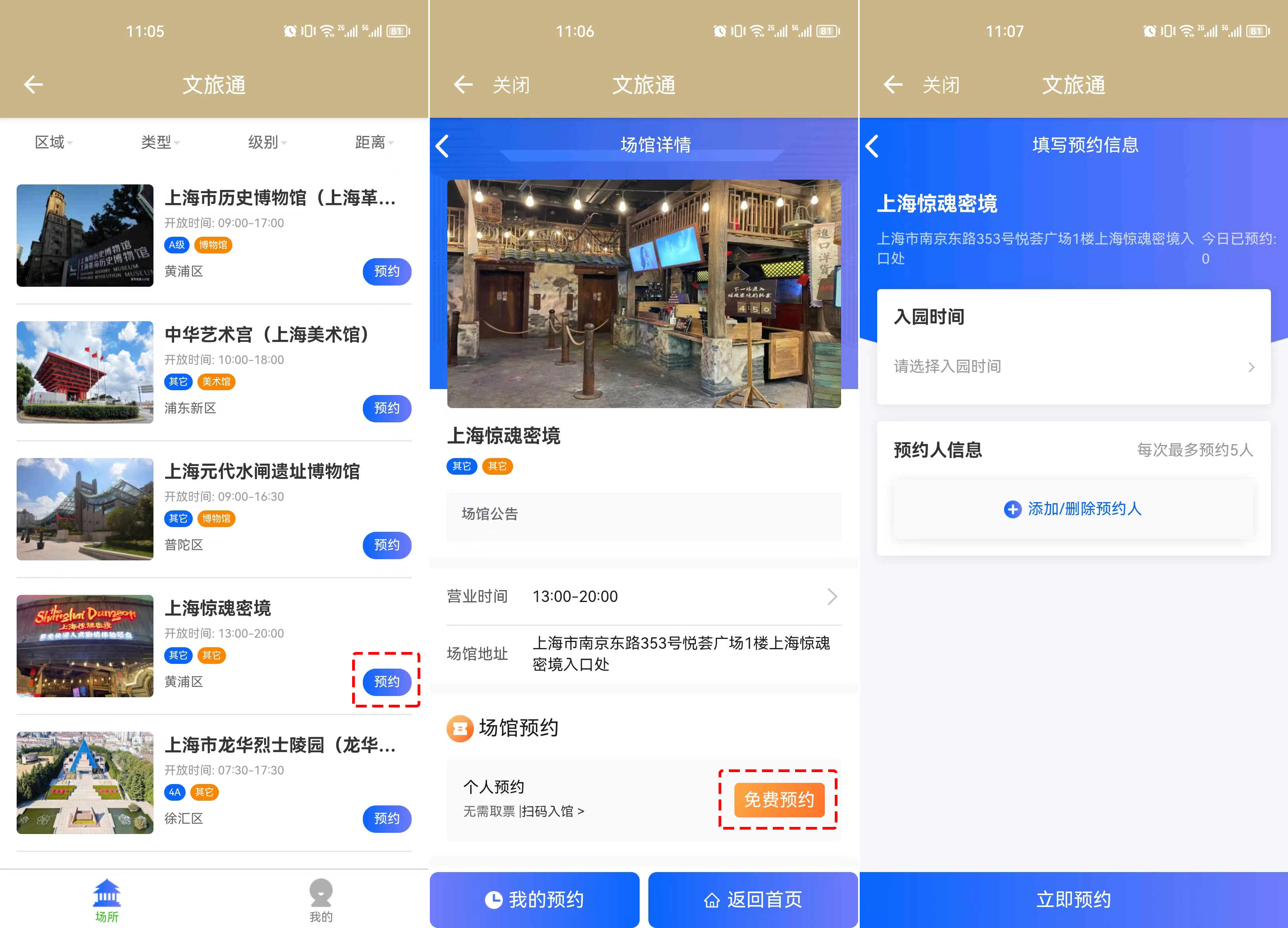 點(diǎn)擊景點(diǎn)/景區(qū)的“預(yù)約”鍵(以上海驚魂密境舉例)→點(diǎn)擊“免費(fèi)預(yù)約”→選擇入園時(shí)間和預(yù)約人信息
